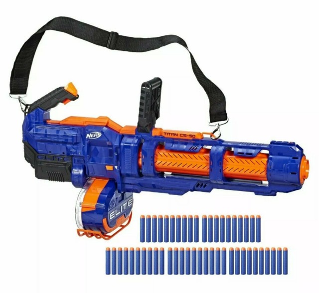 It comes packaged with a fifty dart drum , fifty elite darts , a shoulder strap, and instructions. You can start a toy battle with your child using nerf elite blasters. The nerf elite titan cs 50 toy blaster comes with 50 official nerf elite darts, enough to fully load the blaster 50 dart drum.
